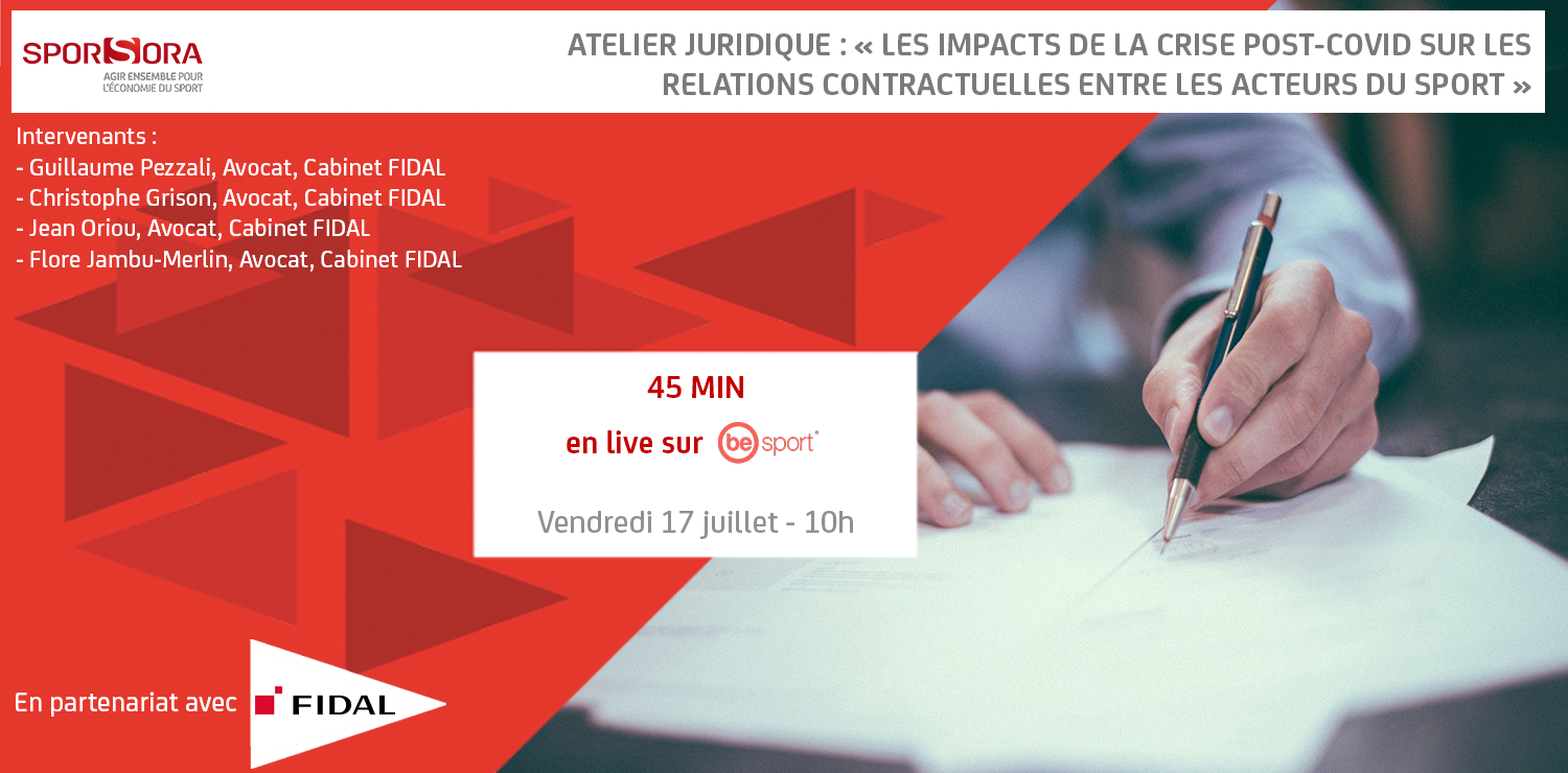 SPORSORA vous donne rendez-vous le vendredi 17 juillet à 10h pour son atelier juridique concernant les impacts de la crise sur les relations conractuelles entre les acteurs du sport.