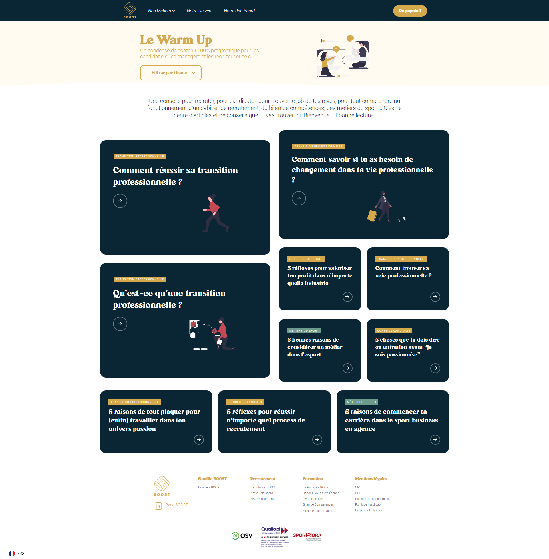 https://www.boost-partners.io/blog) pour découvrir en avant-première le Warm Up et une 1ère sélection d’articles comme : ● 5 raisons de considérer un métier dans l’eSport : lien ● 5 raisons de commencer ta carrière dans le sport business en agence : lien ● 5 réflexes pour réussir n’importe quel process de recrutement : lien Tu pourras ensuite y découvrir un nouvel article chaque semaine !