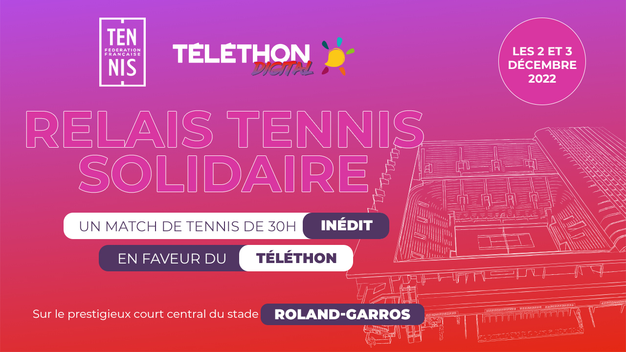 Dans le cadre de ce Téléthon Digital, la FFT a souhaité s’engager activement en organisant le « relais tennis solidaire » sur le court Philippe-Chatrier, pendant les 30 heures d’émission. Les participants, des acteurs du monde du tennis (anciens joueuses ou joueurs de l’équipe de France, élus de la FFT, bénévoles, arbitres, salariés de la FFT, personnalités, journalistes) mais pas seulement (streamers, influenceurs, artistes, chercheurs…), se relaieront pour disputer ce match de tennis en double. 60 à 80 paires se succéderont ainsi sur le court Philippe-Chatrier tout au long de cette opération.