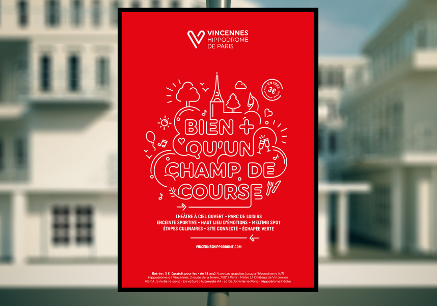 Le « Temple du Trot » a changé de nom pour devenir le Vincennes Hippodrome de Paris. Ce changement de nom répond à deux objectifs principaux : affirmer son statut d’enceinte sportive moderne et accueillir un public plus large. L’agence Pulp, associée à l’agence Désigne, a créé le logotype, le territoire visuel et la charte graphique avec l’idée de rompre avec les codes classiques du monde hippique pour donner un élan résolument contemporain à ce lieu si unique. Elle s’est également consacrée à son application et son déploiement.