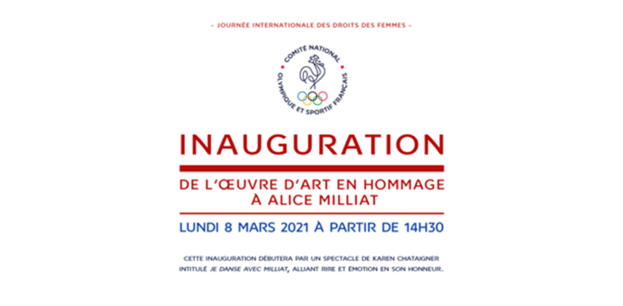 Alice Milliat fait son entrée à la Maison du Sport français Alice Milliat, pionnière du sport féminin français, fait, ce 8 mars 2021, en cette journée internationale des droits des femmes, son entrée à la Maison du sport français. Une oeuvre d’art à son effigie y a été révélée, par Denis Masseglia, Président du CNOSF, et Françoise Milliat, descendante de la première ambassadrice du sport féminin, en présence de Jean-Michel Blanquer, Ministre de l’Education nationale, de la Jeunesse et des Sports, Roxana Maracineanu, Ministre déléguée chargée des Sports, Guy Drut et Tony Estanguet, membres du Comité International Olympique, et Aurélie Bresson, Présidente de la Fondation Alice Milliat.