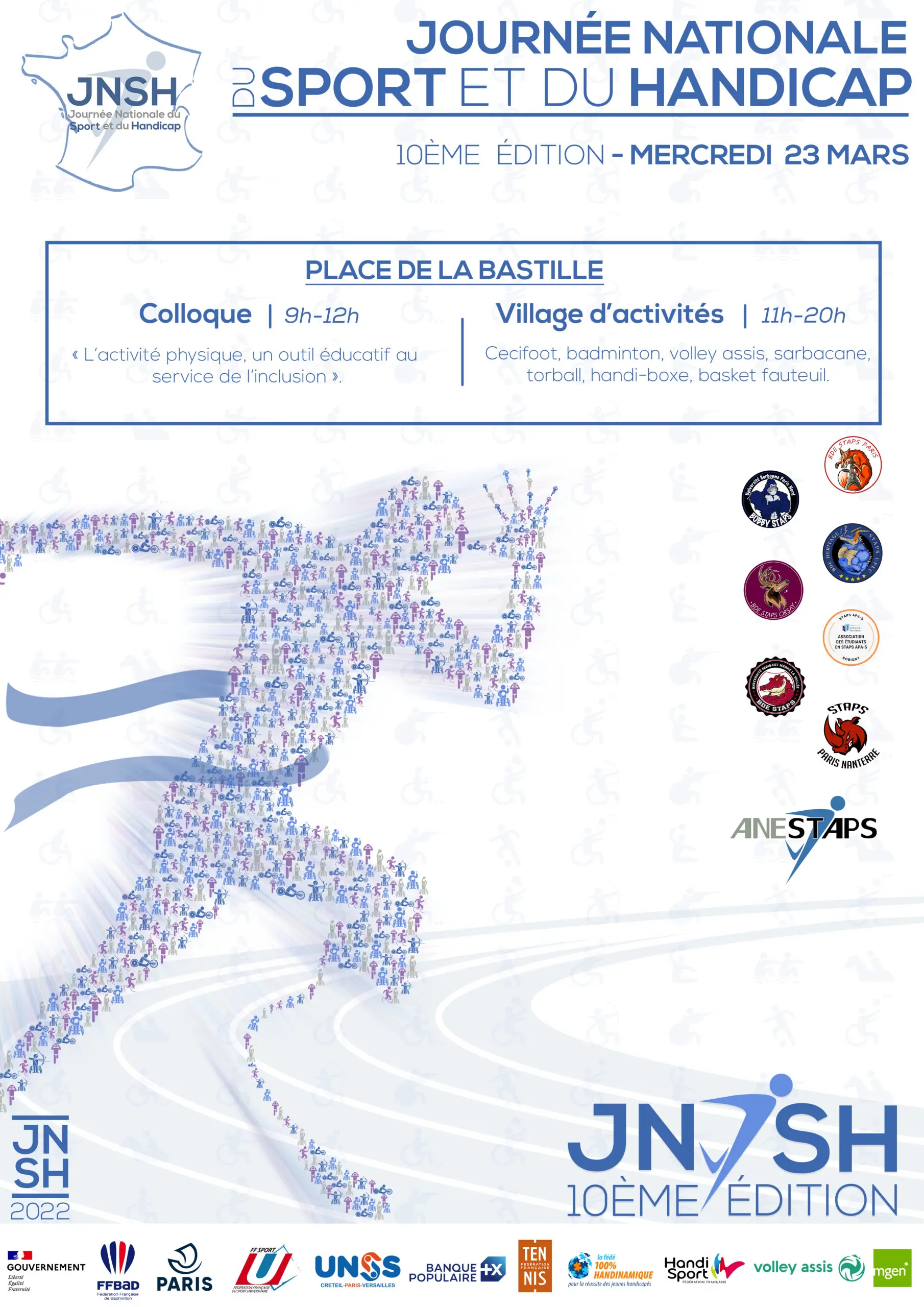 Le mercredi 23 Mars 2022, l’Association Nationale des Étudiants en STAPS organise la 10ème édition de la Journée Nationale du Sport et du Handicap. L’ensemble du réseau de l’ANESTAPS se mobilise pour cette journée.