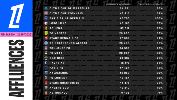 Confirmant une tendance structurelle à la hausse, l’affluence moyenne par stade atteint elle aussi un nouveau record à mi-saison avec 27.505 spectateurs de moyenne, en hausse de 0,2% par rapport à la mi-saison 2024-2025. Cinq clubs (Olympique de Marseille, Paris Saint-Germain, Olympique Lyonnais, LOSC et RC Lens) dépassent la barre des 35.000 spectateurs de moyenne par match.