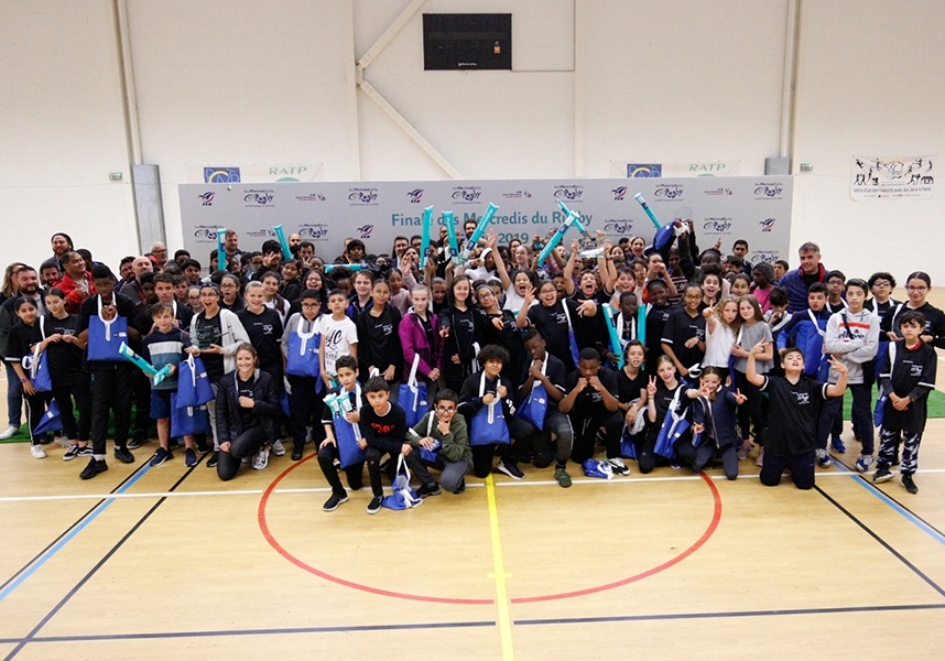 Entourés des internationaux français Julie Annery et Dimitri Szarzewski, marraine et parrain du programme, les 6ème F du collège Hector Berlioz (75018 Paris) ont reçu à cette occasion le trophée « Mercredis du Rugby 2019 ». Cette récompense, remise par les membres du jury et par la journaliste sportive et animatrice du Groupe Canal+, Astrid Bard, traduit leur interprétation et leur engagement en faveur d’un comportement citoyen dans le sport comme dans les transports.