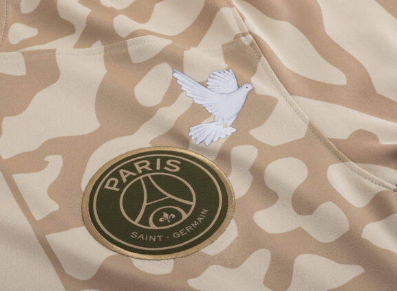 Depuis leur première collaboration, le Paris Saint-Germain et 3.Paradis ont toujours cherché à véhiculer des messages forts à travers des créations audacieuses. Pour cette troisième édition, les deux marques ont décidé de sublimer le quatrième maillot de la saison 2023/2024 avec un design inédit et symbolique. L’emblématique imprimé éléphant du quatrième maillot a été rehaussé de symboles puissants, dont 12 mains de couleurs de peau variées, représentant symboliquement les 12 titres de champion de France remportés par le club. Les mains tendues vers le ciel, forment le signe 12, illustrant également l’inclusion et la diversité du club. A droite du logo Paris Saint-Germain, une colombe blanche, emblème de la marque 3.PARADIS, a été ajoutée pour renforcer le message de paix et d’amour véhiculé par les deux marques.