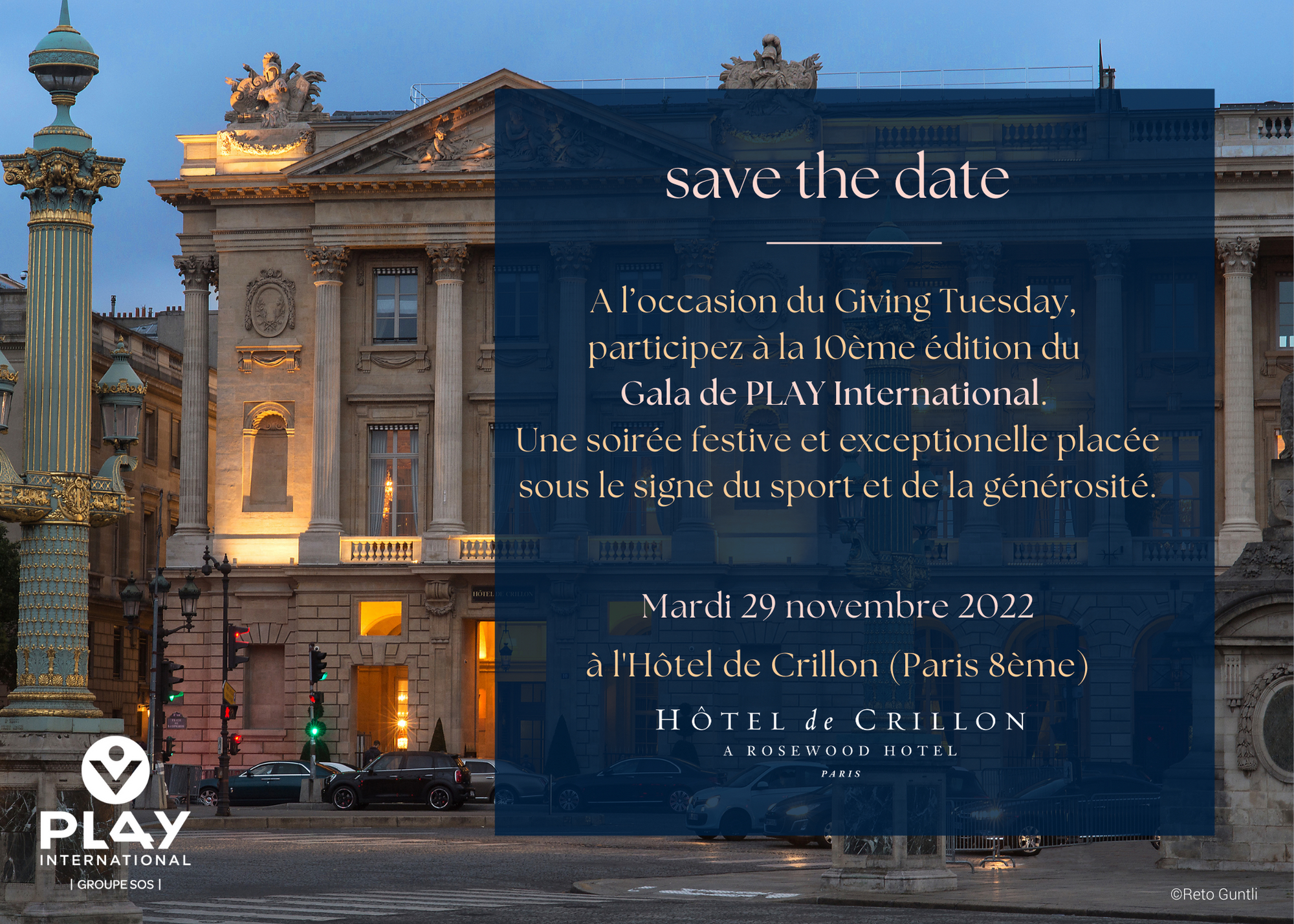 PLAY International a le plaisir de vous annoncer que la 10ème édition du Gala de PLAY International aura lieu le mardi 29 novembre 2022 à l’Hôtel de Crillon (Paris 8ème).