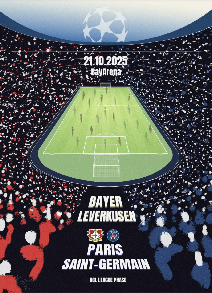 Imaginée pour la rencontre entre le PSG et le Bayer Leverkusen, cette œuvre retranscrit l’énergie des tribunes et la ferveur des grands soirs européens, à travers un regard artistique et moderne.
